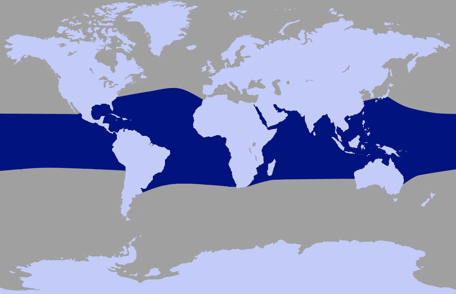 Fraser's Dolphin Ecology Range:Tropical waters usually between 30°N and 30°S. Usual Habitat: Relatively deep, offshore waters but sometimes found in deep, coastal waters. Usual group size: Largely unknown. Main Diet: Mesopelagic fish, crustaceans and cephalopods | Global range of the Fraser's Dolphin