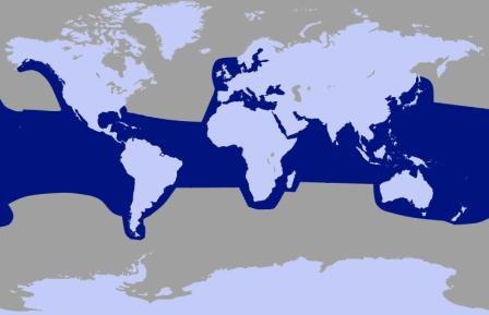 False Killer Whale Ecology Range:Tropical and warm temperate waters usually between 50°N and 52°S. Usual Habitat: Relatively deep, offshore waters but sometimes found in shallow, coastal waters. Usual group size: Strongly bonded groups of 10 - 50 individuals, sometimes up to 300 animals. Main Diet: Primarily cephalopods and fish (including large species such as tuna and mahi-mahi) and sometimes they attack small cetaceans, Humpback Whales and Sperm Whales. Local population: Unknown | Global range of the False Killer Whale ![]() Dark blue areas indicate where False Killer Whales are likely to be found |