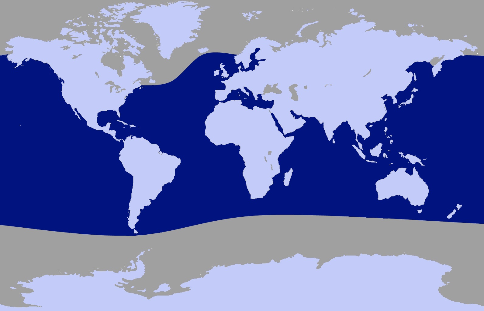 Cuvier's Beaked Whale Ecology Range: Temperate, sub-tropical and tropical waters. Usual Habitat: Usual group size: Often alone or in groups of 3 - 12 Main Diet: Squid and occasionally fish, possibly crustaceans. Local population: Unknown | Global range of Cuvier's Beaked Whale ![]() Cuvier's Beaked Whales are likely to be found in the dark blue areas |
