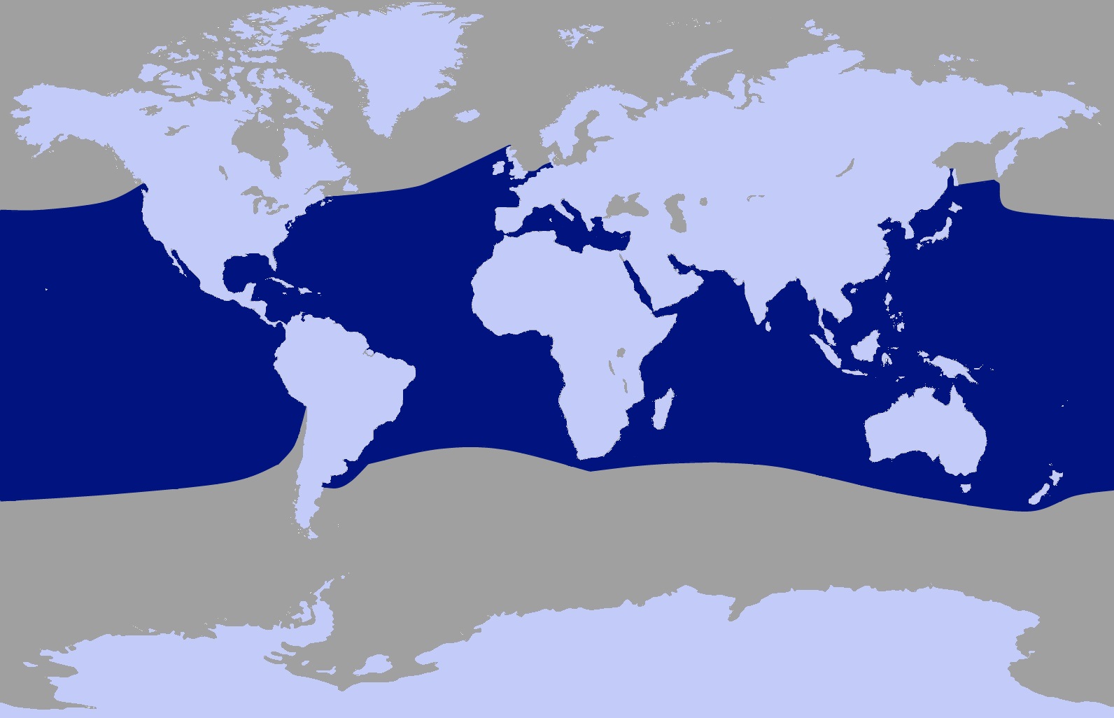 Striped Dolphin Ecology Range: Tropical and temperate waters Usual Habitat: Generally beyond the continental shelf Usual group size: 20-50 occasionally 100s Main Diet: Schooling fish and cephalopods | Global range of the Striped Dolphin ![]() Dark blue areas indicate where Striped Dolphins are likely to be found |